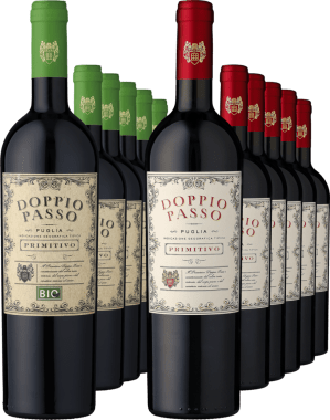 Doppio Passo bietet wahren Trinkgenuss und Lebensfreude zum sensationellen Preis-/Genussverhältnis. Die beliebten und ausgezeichneten Doppio Passo Primitivo bieten wir dir jetzt in einem Gemischten Doppel an. Du erhältst jeweils sechs Flaschen und sparst bei beiden Weinen. Ein Top-Deal!