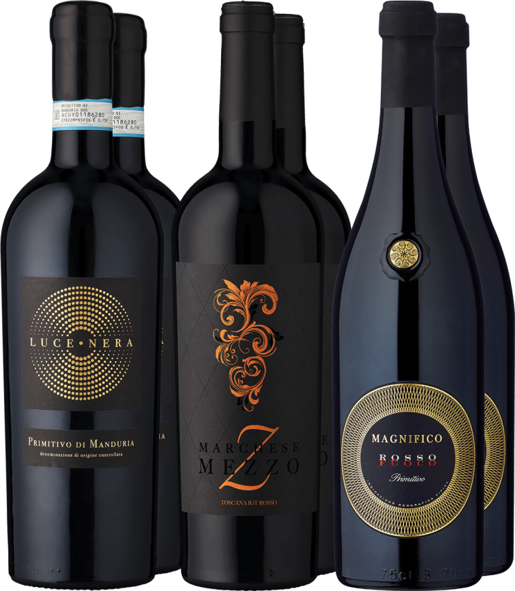 Im Glas zeigen sich unterschiedliche Facetten italienischer Rotweinkunst: Der Luce Nera Primitivo di Manduria begeistert mit dunkler Frucht und samtiger Tiefe, während der Magnifico Fuoco Primitivo aus Apulien würziger, kraftvoller und wunderbar einladend wirkt. Aus der Toskana ergänzt der Marchese Mezzo »Z« das Trio mit Eleganz, feiner Struktur und einem Hauch mediterraner Kräuter. Ob beim Dinner mit Freunden, zu einem festlichen Menü oder einfach als genussvolle Entdeckung auf dem Sofa – dieses Paket lädt dazu ein, zu vergleichen, zu genießen und italienische Vielfalt neu zu erleben.