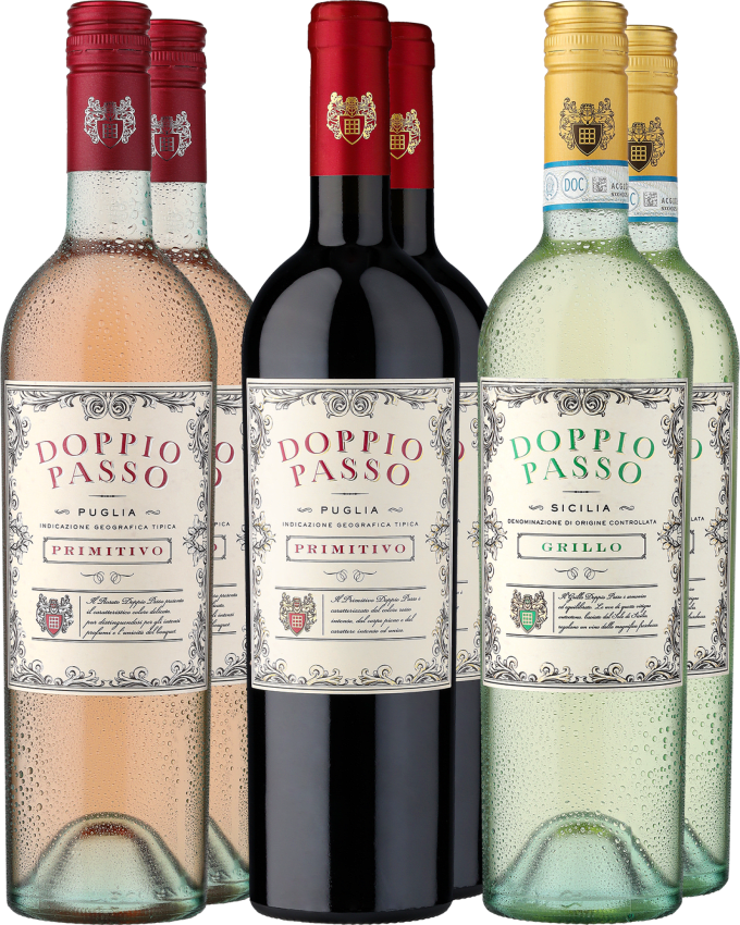 Nutze die Chance, um die gesamte Bandbreite der Doppio Passo-Weine kennenzulernen. Also worauf warten? Lass dich noch heute von der sanften Kraft unserer Doppio Passo-Weine in Weiß, Rot und Rosé verführen!
