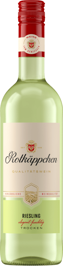 Dieser trockene Weißwein überzeugt mit Feinfruchtigkeit aus qualitativ hochwertigen Trauben. Das fruchtig frische Bukett erinnert an grünem Apfel, Aromen von Zitrusfrüchten und reifen Pfirsichen. Im Glas zeigt sich der Rotkäppchen Qualitätswein Riesling trocken mit hellgelbem Glanz und am Gaumen überzeugt die Riesling-typische spritzige Säure.